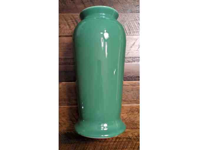 This years custom Fiesta item was introduced in 2002 and discontinued in 2007 the Monarch Vase. The 12 individually numbered vases are glazed in Meadow (2019 new color). Dimensins are 9-1/4" tall x 4-1/4" diameter with 2-1/4" hole in top. Bottom is stamped in Gold letters, "Made exclusively for East Liverpool High School Alumni Association 2022 Number 1 of 12". Condition is new and only small flaw is a rough spot in glaze on top rim.