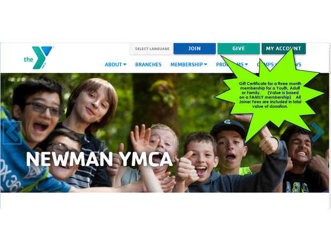 Gift Certificate for a three month membership for a Youth, Adult or Family. (Value is based on a FAMILY membership) All Joiner Fees are included in total value of donation.