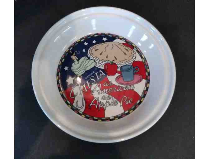 Homer Laughlin Fiesta Pie Plate glazed in white and decorated with American Pie theme, Boscov's on the back, 10" diameter, looks new with no defects