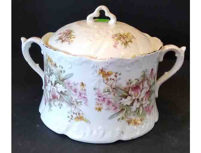 Sterling China White Covered Serving Bowl Floral Pattern, has crack in lid and chipped on inside of lid, 6" diameter x 5" high
