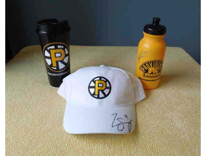 A P-Bruins water bottle signed by goalie Jon Gillies a former colleigate star at Providence College who was signed by the Calgary Flames in 2015. In 2021-2022 he moved around quite a bit playing for the Maine Mariners, Providence Bruins and had short stints with the St. Louis Blues and New Jersey Devils of the NHL