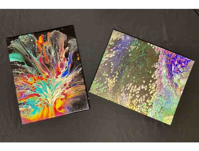 Includes two acrylic paintings. One has a black base with vibrant multicolor bubble waves with hints of gold and silver. The next painting takes you under the sea with blue, green, white, and purple tones mixing magically together.