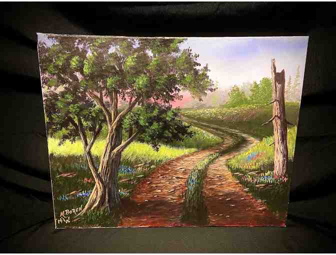 This beautiful acrylic painting is of a beautiful meadowed area during sunset with hues of pink and blue. There is a rocky road going through the middle of the painting. Where do you think it's headed? Maybe straight to your house!
