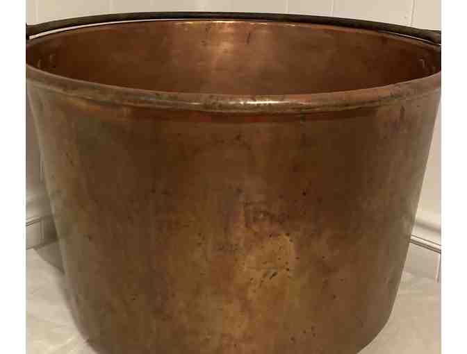 Vintage copper kettle with some denting and discolor but in GOOD CONDITION; 16" x 23 1/2" x 6 1/2" deep