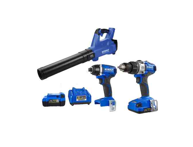 The Kobalt 24-Volt Max brushless combo kit comes with 3 essential tools to help you complete a wide range of projects around the home. The kit comes complete with a drill/driver, impact driver, and leaf blower. But no kit is complete without the essentials: a 2.0Ah battery, 4.0Ah battery, and standard 45 watt charger.