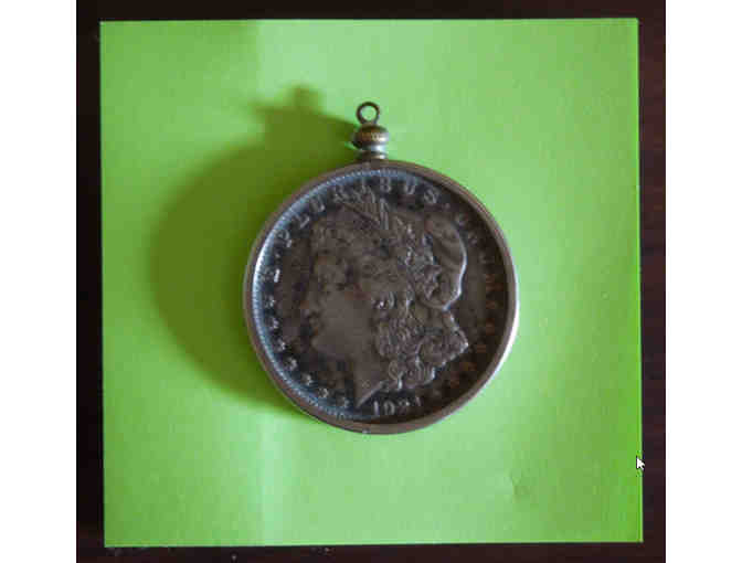 A friend of the shelter has donated a 1921 Morgan Silver Dollar in a bracket that could be attached to a chain to wear as a pendant.