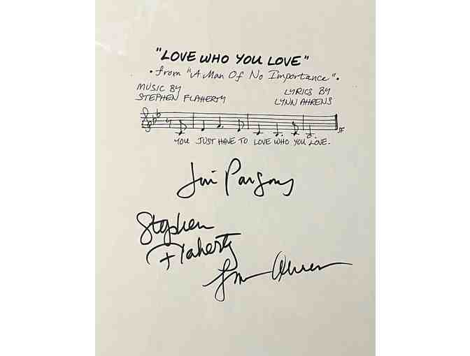 "Love Who You Love" musical phrase from A Man of No Importance, handwritten and signed by Lynn Ahrens, Stephen Flaherty and Jim Parsons