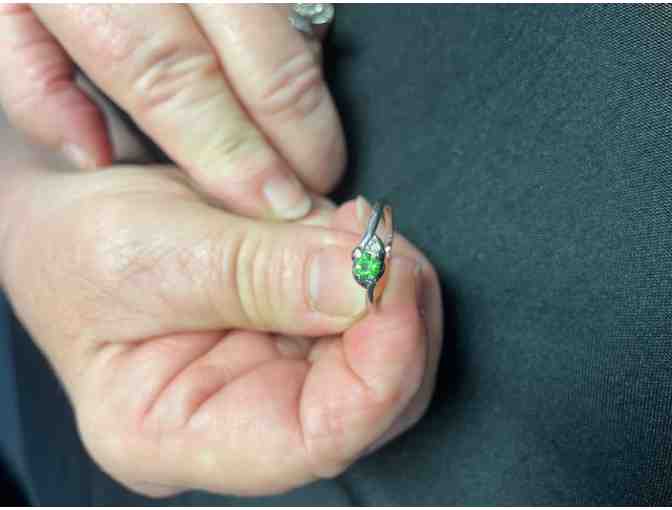 This this ring is silver with a beautiful light green gem in the middle! The perfect gift for any August baby!