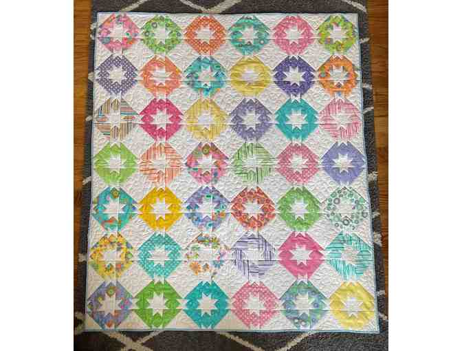 Beautiful handmaid, full-size quilt created by Aly Smith, featuring a colorful star pattern.