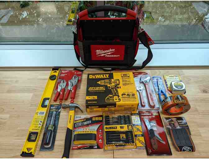 Get started on your home project with this tool kit gift basket! This kit includes a heavy duty Milwaukee packout bag which contains the atomic series cordless Dewalt 1/2" Hammer Drill/Driver kit with a 20v Lithium Ion Battery. One Dewalt 35 piece combo drill bit and screwdriver set. A set of two Milwaukee vice grips (7" and 10"). One 6" and a 10" crescent wrench by Crescent. One 8" needle nose pliers. One 25' Stanley powerlock tape measure. One 2-IN-1 Folding utility knife and sporting knife. One Stanley hammer. One Klein Tools 11-IN-1 magnetic screwdriver/nut driver set. One Stanley 24" bubble level. One Franklin sensors ProSensor M70 professional stud finder. One Klein Tools magnetic wristband. One large roll of Gorilla Tape. Last but not least a $100 Home Depot gift card.