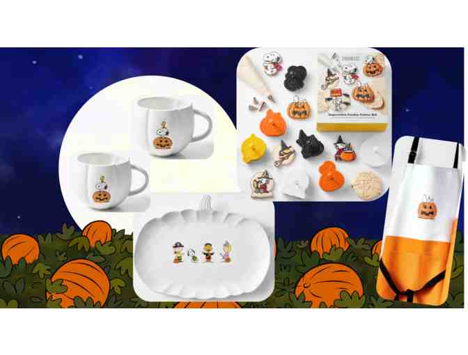 Tis the season...for the Great Pumpkin! Celebrate Halloween with Charlie Brown, Snoopy, and the gang! Peanuts cookie cutters and a platter to display those cookies on, 2 mugs for sipping hot cocoa while the cookies bake, and Peanuts-themed towels for the clean-up!