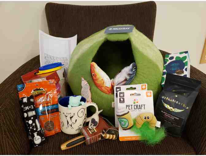 Don't miss out on this purrfect basket! This coffee and tea themed basket includes a cat cave, $50 MudBay gift card, 8 stuffed cat toys (including a homemade science cat kicker), mystery motion interactive cat toy, chicken cat treats, wet food can covers, brush, and for you, a cat person mug, Black Cat espresso roast by Illuminating Coffee, Blueberry fields forever tea, a cat themed kitchen towel, and a loose leaf kit-tea steeper. We're not kitten around here, bid before it's gone. Donated by the Protein Solutions Team.