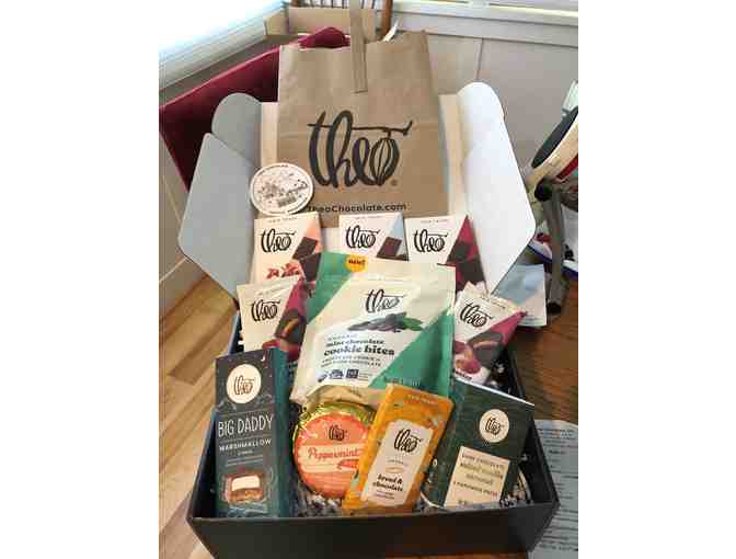 Curb your chocolate cravings with this basket containing an assortment of chocolates from Seattle local Theo Chocolates, as well as an assortment of Swiss chocolates. Basket contains various chocolate bars and treats from Theo Chocolates and a box of assorted chocolates direct from Switzerland.