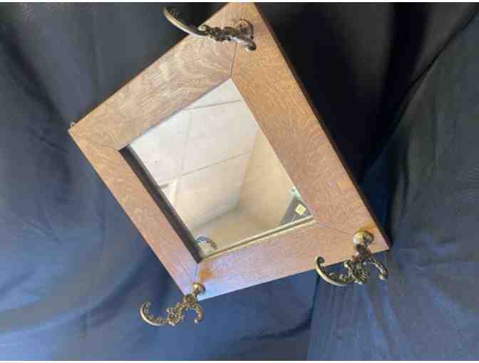 This beautiful mirror has a wooden frame with golden metal hooks. Perfect for an entryway into a home. Good for hanging coats, umbrellas, or keys- or asking who is the fairest of them all?