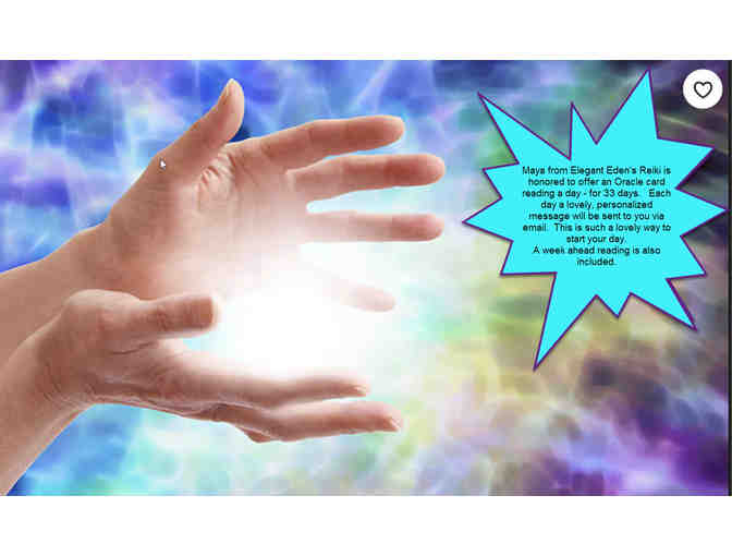 Maya from Elegant Eden's Reiki is honored to offer an Oracle card reading a day - for 33 days. Each day a lovely, personalized message will be sent to you via email. This is such a lovely way to start your day.