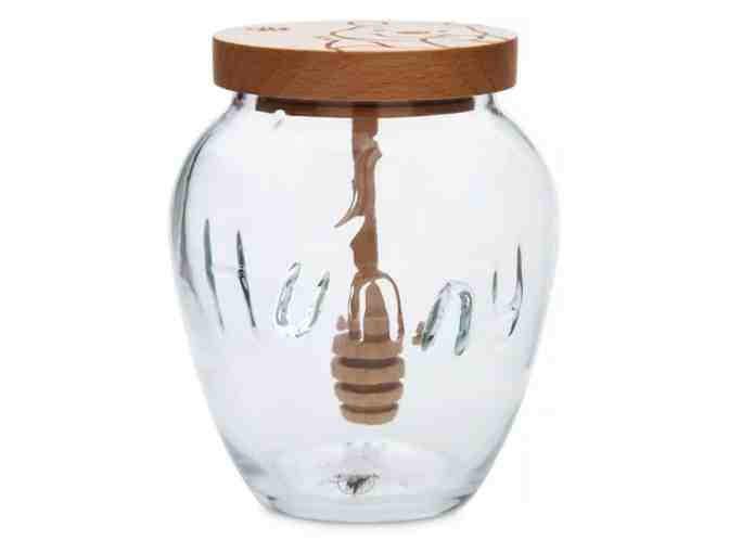 Although by nature Winnie the Pooh has more of a glass half empty outlook, like you he'll be very happy when this glass is full of ''Hunny.'' The lovable bear is featured on the wooden lid which includes a honey dipper, while the glass honey jar has Pooh's original spelling of his favorite food.