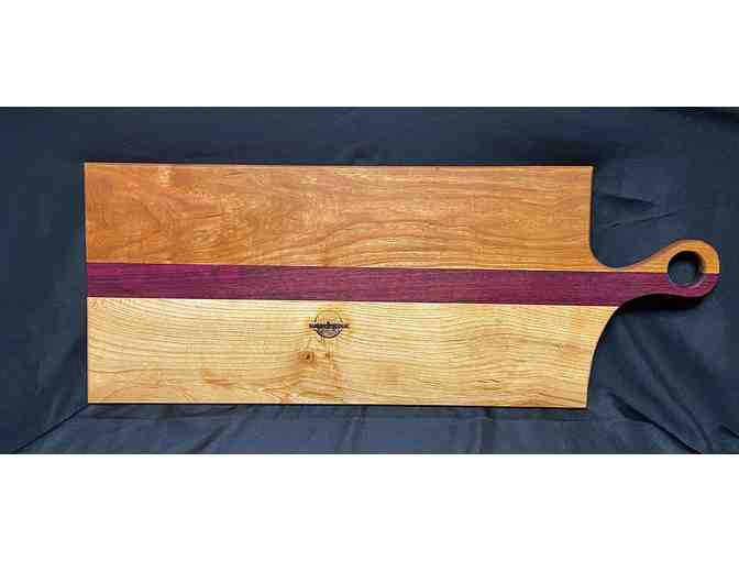 What you are looking at is a beautiful charcuterie board made from luscious maple, cherry, and African purpleheart hardwood, handmade by Dannal Newman. This massive board features a soft round over detail around the edges and a shaped handle with a hole for hanging. Knots have been filled with epoxy resin and the board has been sanded smooth and quenched with a food safe mineral oil blend made by Walrus Oil and hand rubbed and buffed with their beeswax-based Wood Wax.