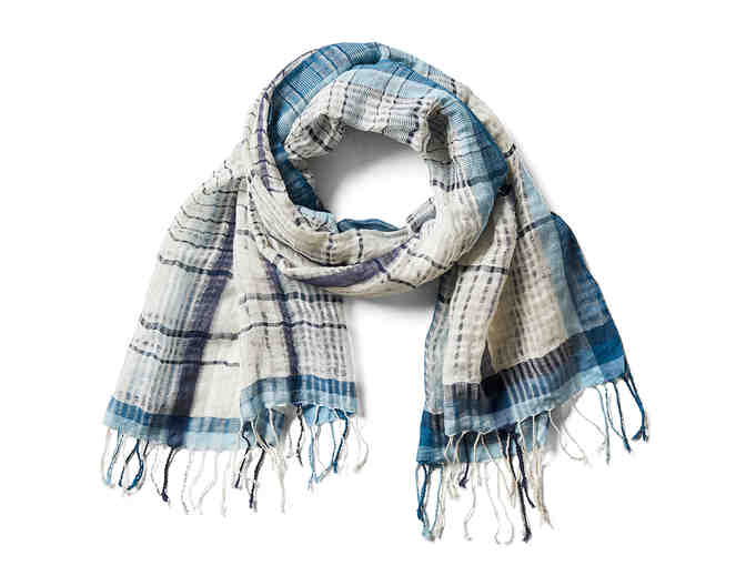 Cotton threads are woven together to create this lightweight plaid scarf. Open weave for airy texture. Twisted and knotted fringe ends. 100% cotton. 71"l x 21"w.