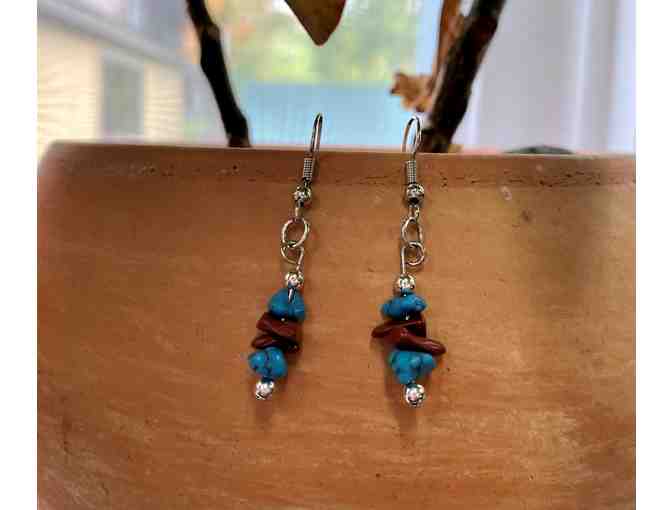 Real Tourqoise and Garnet dangling nugget, hand made earrings.