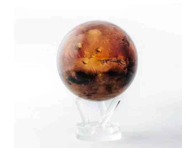 This Mars globe combines vibrant artwork with our patented technology, creating a flawless rotation without batteries or messy cords.  Hidden solar cells use ambient natural or artificial light for power, while the earth's magnetic field provides the necessary torque.  These elements works seamlessly to power a 'whisper-quiet' mechanism, allowing the globe to rotate within its clear outer shell.  Each piece is assembled with such precision, it appears the inner and outer layers are one - rotating without any power source.  3-prong stand included.