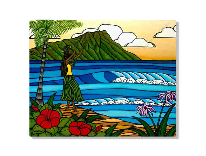 8"x10" metal print of Hula Grill by Hawaii local artist and North Shore Oahu surfer, Heather Brown, features a Hawaiian hula girl dancing on the beach with a backdrop of Diamond Head Crater, crashing blue waves, palm trees, tropical red flowers, and a sunset yellow sky.