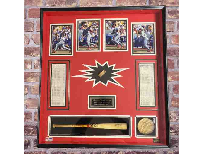 Bid to win this Shadowbox display with a piece of the bat used in the game where Mark McGwire's accomplished his record-breaking 70 Home Run season while playing for the St. Louis Cardinals. PSA DNA Certified