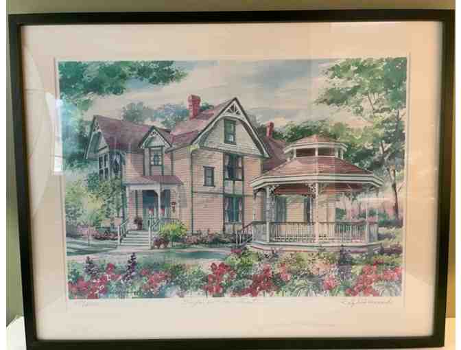 This matted and framed print of a Victorian house and gazebo measures 27" x 21" and is by Ralph Furmanski, a graduate of the American Academy of Art in Chicago. Mr.. Furmanski also teaches watercolor painting. He specializes in painting houses and buildings associated with famous golf courses. This print is signed and labeled 170/2000.