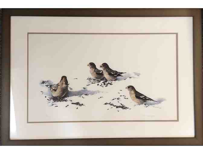Painting of Birds professionally framed in a brushed bronze color metal frame.