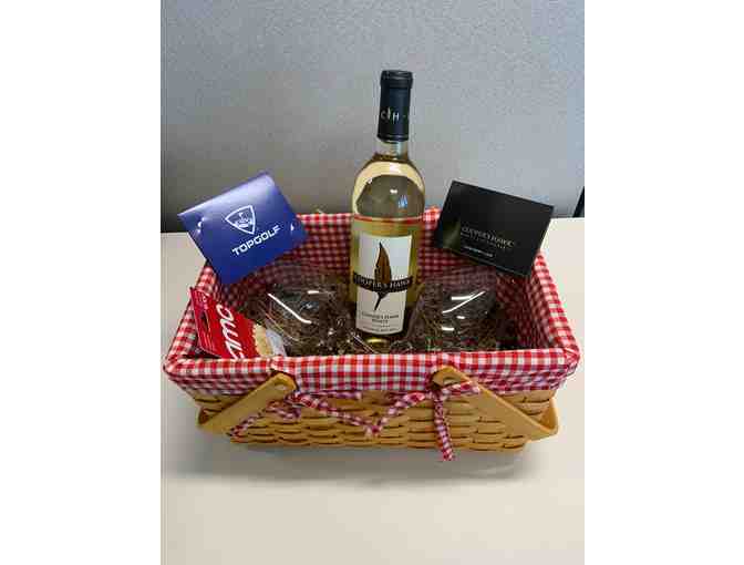 Everything you need to have a perfect night out for two is only one reach away with this amazing gift basket sure to make your date night go off without a hitch. Basket contains gift cards for dinner and activities, bottle of wine, and glasses.