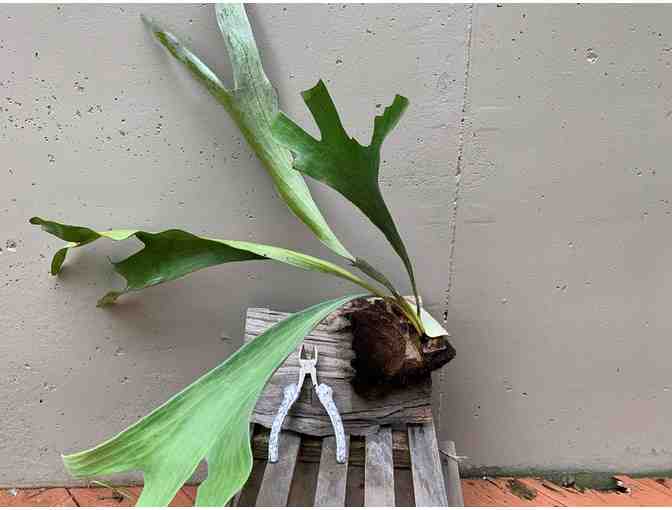 Live Staghorn fern plant mounted to a rustic oak slab. Plant is approximately 18” tall. Cutting shears are for size reference and not included as part of the purchase.
