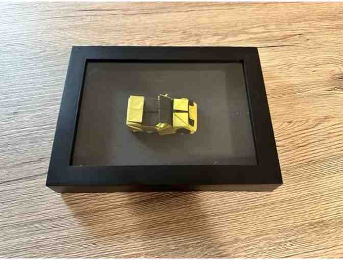 This origami Sports car was designed by Hadi Tahir and folded by an experienced artist. It was folded from a single sheet of archive-quality metallic paper, treated, and cut into a perfect square. This piece required several folds and hours of work. The piece comes with a shadow box ready for display.