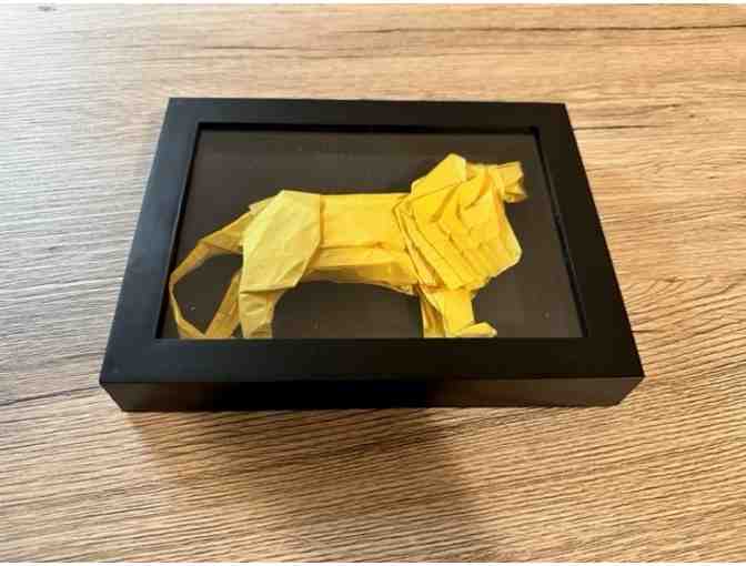 This origami lion was folded from a single sheet of archive quality paper, treated, and cut into a perfect square. This piece was designed by Satoshi Kamiya, one of the most famous origami artists in the world, and folded by an experienced origami artist. It required hundreds of folds and many hours of work. The piece comes with a shadow box ready for display.