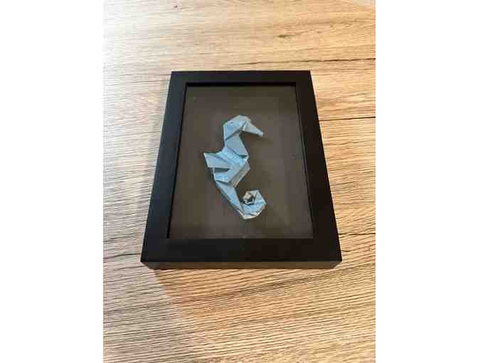 This origami seahorse was designed by Michael LaFosse, one the most famous origami artists in the world and folded by an experienced artist. It was folded from a single sheet of archive-quality iridescent paper, treated, and cut into a perfect square. This piece required several folds and hours of work. The piece comes with a shadow box ready for display.