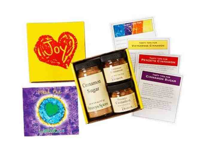 BOX CONTAINS: 1/2 cup jar Cinnamon Sugar, 1/4 cup jar Vietnamese Cinnamon, 1/4 cup jar Penzeys Cinnamon , Heal the World magnet plus tip cards.