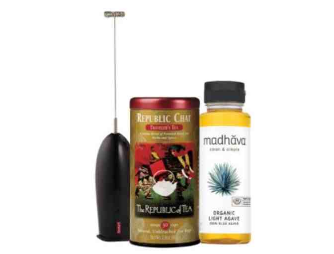 The complete package for a perfect chai latte. Our steam-free, black electric frother works quickly and easily to produce barista-quality drinks at home. A tin of Republic ChaiĀ® tea offers rich imperial spices for a complex and flavorful cup, while organic Agave Nectar adds a delightful hint of healthy sweetness.