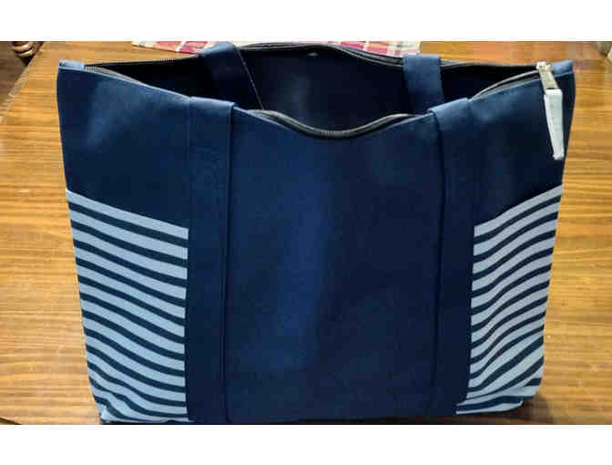Poly/Nylon Blend Tote Bag with zipper in Navy Blue/Stripe