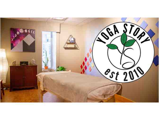 This package includes 30 days of youga, a 60-minute massage, bath bomb, Palo Santo, and a sticker.