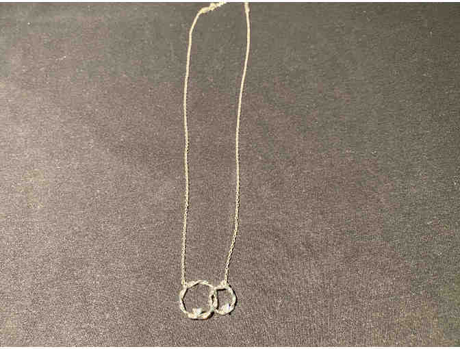 This is such a pretty necklace! It features two sterling silver circles, each with its own tiny heart-shaped sparkling gem. The two circles intersect with one another on a delicate 18-inch linked chain.