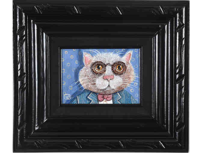 Using acrylics, Barbara Johansen Newman paints portraits of both people and animals, and in doing so tells a story of who or what they are and what they do or like. "Farsighted, Executive Kitty" is one of those. Clearly, he has been reading too many documents at the office lately.