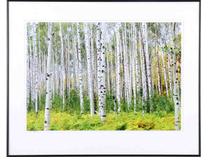 The artist captured this image while on a trip to the Rocky Mountains of Colorado. The extreme depth of field maintains sharp focus deep into the forest. Coloration in the photo is simplified, with the stark white of the trees offset by the pale greens of the forest undergrowth.
