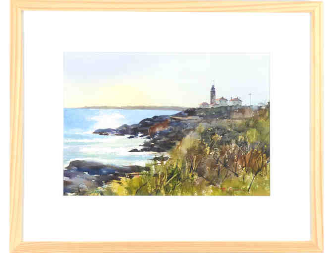 "Mid-Day Bright" is a watercolor that captures the brilliance of sunlight bouncing off the water at Beavertail Point in Jamestown, RI.