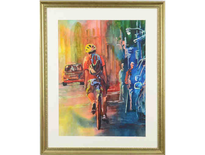 "Biking in Boston" is from a photograph the artist captured while spending a day visiting the city in 2015. Bikers were weaving in and out of traffic on a busy work day.