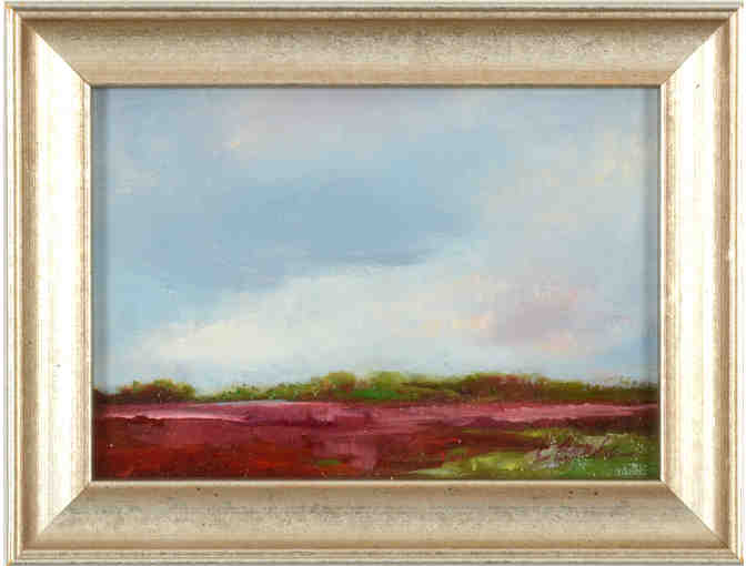"Cranberry Fields," though small in scale has the depth seen in much larger works. The loose brush strokes of complementary colors juxtapose the reds of the bog against the vibrant green landscape. The distant treeline is shaped by a cool blue sky with a beautiful cloud suspended above it all.
