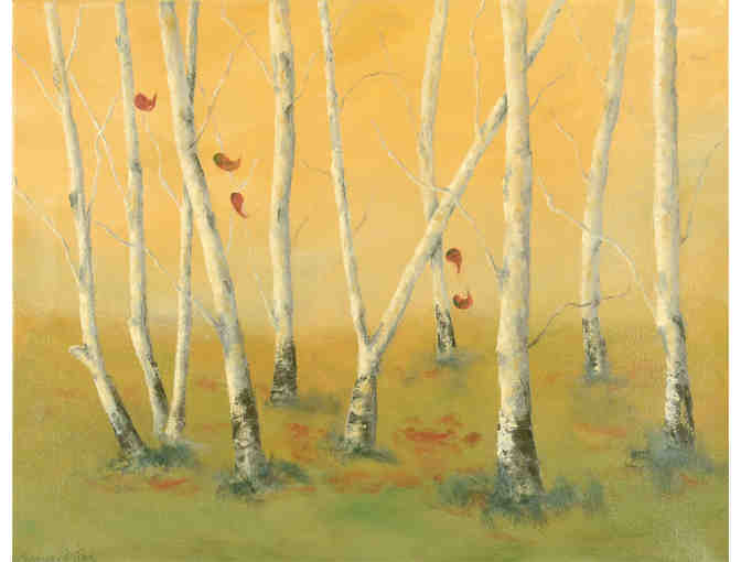 This painting depicts fall colors & leaves drifting down amongst lovely birch trees.