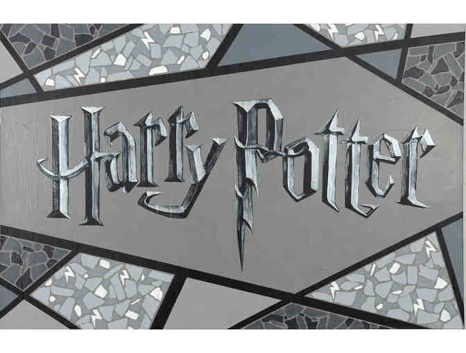 "Harry Potter" draws inspiration from the iconic lettering & logo design in author J.K. Rowling's "Harry Potter" fantasy series. The 3D logo design is juxtaposed with a modern & contemporary pop-art style. Hidden lightning bolts are featured within the artist's signature illusion of mosaic tile. "Voldemort" is painted on the back of the canvas in a violent fashion, a nod to the main antagonist in the Harry Potter series, Lord Voldemort.