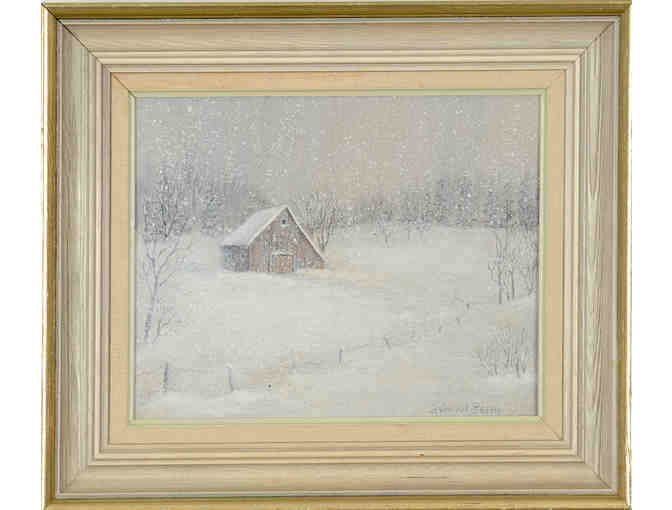Ms. Berg passed away in October of 2005. This piece depicts a wintery landscape with a barn partially covered by snow.