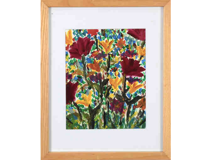 "Flowers" was inspired by a garden in Maine, Mitchell captured a photo and painted this piece when returning home to his studio. Bright yellows and reds dominate the floral scenery with a beautiful blue sky in the background.