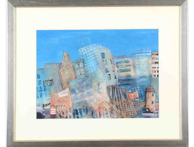 "City Blues" is part of a series of abstract urban landscapes created by artist Beverly Silva. Built intuitively with geometric shapes, limited palette and an abundance of texture, her mixed media cityscapes are narrative works that chronicle her visceral response to her surroundings. They do not portray a specific location, but seek to capture the sights, sounds and essence of the urban environment.