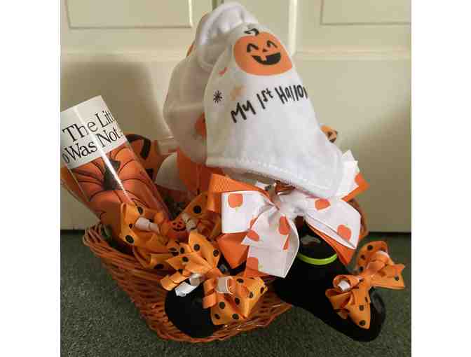 Small orange wicker basket with baby girl essentials (6 mos) pants; onesie, and headband, bandana bib set (6 mos), Boo notecards, booties and the book The Little Old Lady was not Afraid of Anything.