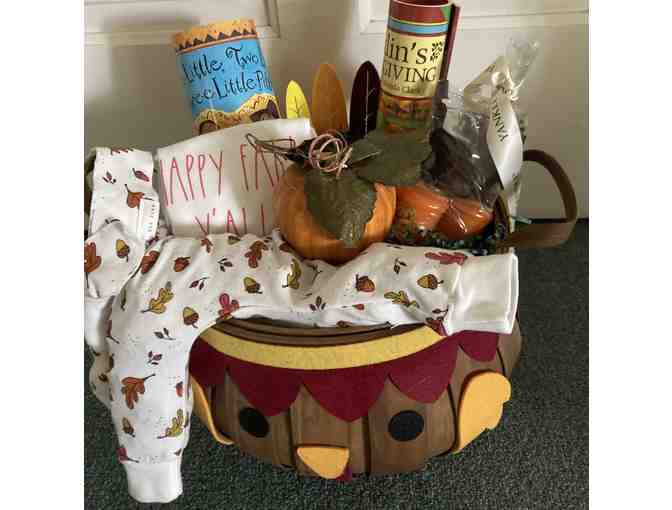 Turkey basket with two books: Franklin's Thanksgiving and One Little, Two Little, Three Little Pilgrms. Also a Yanke Candle Thanksgiving set, Rae Dunn 6-9 mos girls shirt, pants and headband.